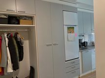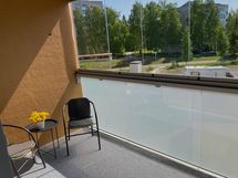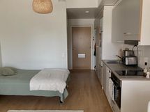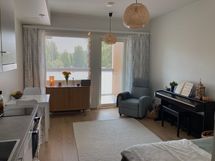 Tehokkaat neliöt, joissa jokaiselle toiminnolle on oma paikkansa. Keittiö ja olohuone muodostavat yhtenäisen, valoisan tilan. Modernit harmaat kaapistot ja kattava varustelu, johon kuuluu mm. astianpesukone, keraaminen liesitaso ja integroitu uuni. Tyylikkäästi laatoitettu kylpyhuone, jossa on tilaa pesukoneelle. Suuri lasitettu parveke toimii lisähuoneena pitkälle syksyyn, tarjoten rauhalliset näkymät ympäristöön. Eteisessä on runsaasti kaappitilaa ja avonaulakko ulkovaatteille.