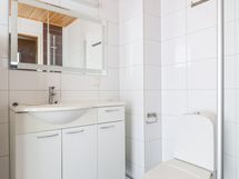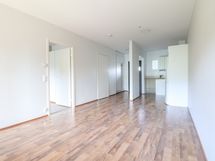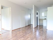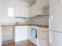 Asunnossa on tummat laminaattilattiat ja valkoiset maaliseinät. Keittiössä varustuksena lattialiesi sekä jääkaappipakastin. Astianpesukoneelle löytyy paikka ja liitäntä. Kylpyhuone on laatoittu, sieltä löytyy myös pyykkikoneelle liitäntä.