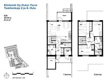 Pohjaratkaisultaan tilava kolmen makuuhuoneen kaksitasoinen perheasunto. Keittiö ja olohuone muodostavat yhtenäisen avaran oleskelutilan. Keittiö on varusteltu kalusteisiin integroidulla induktioliesitasolla ja erillisuunilla sekä erillisellä jää- ja pakastinkaapilla. Lisäksi keittiössä on tilavaraus astianpesukoneelle ja mikroaaltouunille. Olohuoneesta on käynti terassille. Eteisessä on säilytystilaa ulkovaatteille. Alakerrassa on erillinen wc, josta löytyy siivouskomero sekä tilavaraus pyykinpesukoneelle. Eteisen yhteydessä on vaatehuone sekä erillinen varastotila portaikon alla. Asunnon toisessa kerroksessa on kolme makuuhuonetta, kylpyhuone sekä sauna. Kylpyhuoneessa on pyykkikaappi sekä tilavaraus pyykinpesukoneelle ja kuivausrummulle. Asunnon sisäänkäynnin yhteydessä on lämmin irtainvarasto sekä kylmä ulkoiluvälinevarasto. Pysäköintipaikkamaksut: pihapaikka 15€/kk, katospaikka 20€/kk.