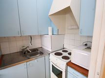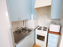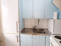 Liesi: sähköliesi. Työtasot: metalli, muu. Kylmäsäilytys: jääkaappi/pakastin.