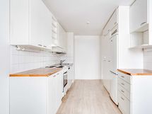 Viidennen kerroksen tilava kolmio. Keittiö-olohuonetila on avara, ja mahdollistaa monet eri sisustusvaihtoehdot. Asunnossa pääset nauttimaan oman saunan löylyistä sekä lasitetun parvekkeen luomasta lisätilasta.
