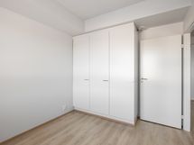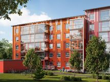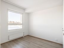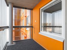 Tässä viidennen kerroksen asunnossa on lasitettu parveke, joka suuntautuu luoteeseen. Myös ikkunat ovat luoteeseen. Ikkunoissa ja parvekkeen ovessa on sälekaihtimet.