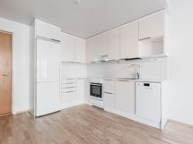 Liesi: keraaminen. Työtasot: laminaatti. Kylmäsäilytys: jää/viileäkaappi. Varustus: liesituuletin, astianpesukone. keraaminen keittotaso