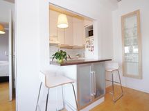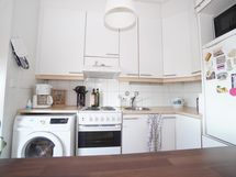 Keittiössä saareke joka ajaa myös ruokapöydän virkaa. Mutta ruokapöytäkin mahtunee kyllä huoneistoon halutessasi. Keittiössä on pyykinpesukone valmiina uudelle asukkaalle. Avokeittiö on avoimena tilana olohuoneen kanssa. Makuuhuone on tilava ja parisängyn lisäksi sinn saat muutakin kalustetta. Kompaktin kokoinen kylpyhuone on kauttaaltaan laatoitettu.