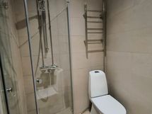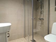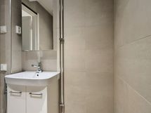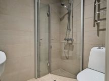 - Suihku, Suihkuseinä, Pesukonevalmius, Peilikaappi, Allaskaappi, Rättipatteri, Halogeenivalot, Laattaseinä, Laattalattia, Lattialämmitys