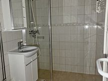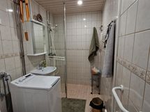- Pesutilojen varusteet: WC-istuin, suihku, pesuallas, suihkuseinä, pesukoneliitäntä, peilikaappi ja allaskaappi. Pesutilojen kuvaus: Kaakeloitu kylpyhuone.