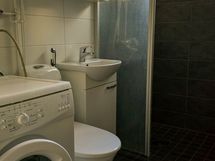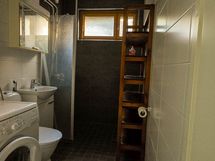 Pesutilojen varusteet: WC-istuin, suihku, suihkuseinä, pesukoneliitäntä, allaskaappi, bidee-suihku ja peilikaappi.