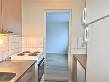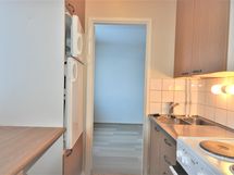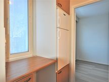 Keittiön varusteet: Jenkkikaappi ja liesi. Liesi: Sähköhella. Työtason materiaali: Laminaatti.