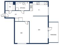 Sijaitsee lähellä palveluita, rauhallinen alue. Kaksi huonetta, keittiö, vaatehuone ja kylpyhuone/wc. 60,5neliötä.