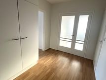Eteisen ja olohuoneen välistä löydät kauniit pariovet, jotka tuovat tilaan avaruutta ja mahdollisuuden muokata huoneiden käyttöä tarpeen mukaan. Lasitettu parveke tarjoaa rauhallisen paikan nauttia aamukahvista.