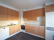 Tilavaan keittiöön saa hyvin sopimaan ruokailuryhmän. Kaappitilaa on mukavasti ja keittiössä on hyvin tilaa ruuanlaitolle. Myös astianpesukone on asennettuna! Lisäksi varustukseen kuuluu keraaminen liesi ja liesituuletin.