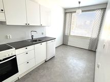 Jääkaappipakastin, sähköliesi, astianpesukone, kaapistot.