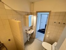 Laatoitetussa kylpyhuoneessa; erillinen suihkutila, pesukoneelle paikka ja liitäntä, wc-istuin, allas sekä peilikaappi.