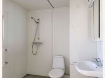 Kodissa on laminaattilattia ja maalatut seinät. Keittiössä on valkoiset kaapistot. Varusteisiin kuuluu arkea helpottava astianpesukone. Kylpyhuoneessa on massalattia ja peltiseinät. Asunnosta löytyy liitännät pyykinpesukoneelle.