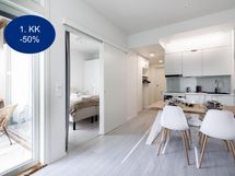 Moderni koti, jossa vaaleanharmaat laminaattilattiat ja vaaleat pinnat. Suuret etelään suuntautuvat ikkunat luovat viihtyisyyttä. Liukuovi erottaa olohuoneen ja makuuhuoneen ja kun ovi on avoinna, koko asunto muodostaa yhden avaran tilan.