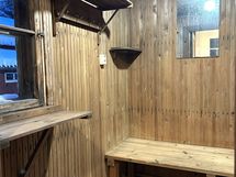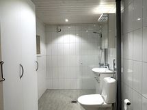 - Sauna, puukiuas, kylpyhuone, suihku, suihkuseinä, peilikaappi, allaskaappi, pesukoneliitäntä, lattialämmitys, kiinteät valaisimet.