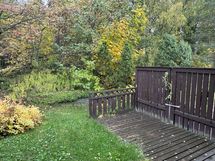 Asunnossa on terassi. Takapihalla pieni alue, jossa terassilaudoitus.