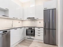 Jääkaappipakastin, induktioliesi, liesituuletin, astianpesukone, kaapistot, kiinteät valaisimet.