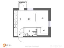 Keittiö, olohuone: vinyylilankku/maali. Eteinen: vinyylilankku/maali. Makuuhuone: vinyylilankku/maali. Kylpyhuone: laatta/laatta.