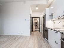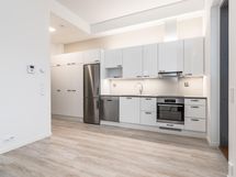 Jääkaappipakastin, induktioliesi, liesituuletin, astianpesukone, kaapistot, kiinteät valaisimet.
