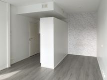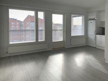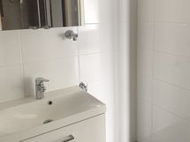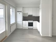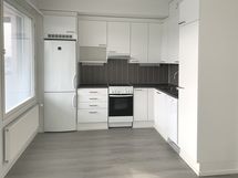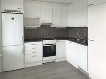 - keittiön kaapistot valkoinen, sileä ovi, metallivedin, keraaminen liesi, liesituuletin, astianpesukone (45cm), jääkaappi/pakastin