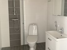 - Pesutilojen kuvaus: pesuhuone kokonaan kaakeloitu, allaskaapisto, wc, kääntyvä suihkuseinä. Varustus: pesukoneliitäntä, wc-istuin, suihku, peilikaappi, kiinteät valaisimet.