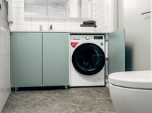 - Suihku, Suihkuseinä, Kuivausrumpu, Pesukone, Rättipatteri, Allaskaappi, Peilikaappi, Laattaseinä, Laattalattia, Lattialämmitys