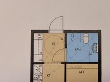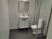 Suihku, Suihkuseinä, Pesukonevalmius, Peilikaappi, Allaskaappi, Laattalattia, Laattaseinä, Lattialämmitys