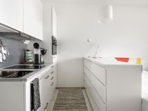 Liesi: induktio, erillisuuni. Työtasot: laminaatti. Kylmäsäilytys: jääkaappi/pakastin.
