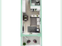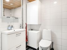 Varustus: suihkuseinä, pesukone, pesukoneliitäntä, wc-istuin, suihku, peilikaappi, peili, kylpyhuonekaapisto.