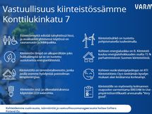 Taloyhtiön käyttöaikainen kiinteistösähkö ja lämpö ovat hiilidioksidipäästöttömiä. Tämä tarkoittaa, että kiinteistölämpö on tuotettu joko uusiutuvan kaukolämmön tai maalämmön kautta ja kiinteistösähkö on uusiutuvaa. Voit lukea lisää vastuullisuudesta Varman asunnoissa: https://www.varma.fi/vuokra-asunnot/ajankohtaista-vuokra-asunnoista/artikkelit/usein-kysyttya-varman-asuntojen-vastuullisuudesta/.