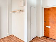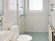 Kylpyhuone on laatoitettu ja siellä on tila ja liitäntä pyykinpesukoneelle. Kodissa on laminaattilattiat ja maalatut seinät.