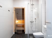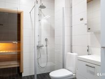 Varustus: suihkuseinä, pesukoneliitäntä, lattialämmitys, wc-istuin, suihku, peilikaappi, kiinteät valaisimet, kylpyhuonekaapisto.