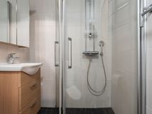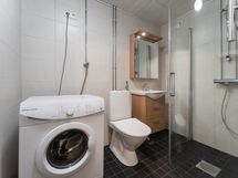Varustus: suihkuseinä, pesukoneliitäntä, wc-istuin, suihku, peilikaappi.