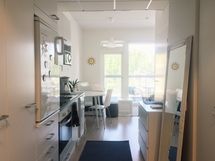 Valoisa, tehokaspohjainen päätyhuoneiston yksiö 2. kerroksessa. Koko asunnon lattialämmitys ja huoneistokohtainen ilmanvaihto tuovat mukavuutta. Avokeittiö on toteutettu tilaa säästävänä seinärivinä (astianpesukone, kalusteuuni, keraaminen taso, liesituuletin, jääkaappi pk-lokerolla).