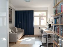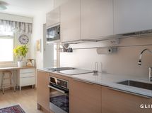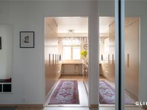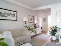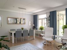 Olohuone on erityisen avara, ja varustettu vehreillä sisäpihanäkymillä. Olohuoneesta on yhteys tilavalle parvekkeelle, jossa on kiinteästi asennettu markiisi suojaamaan pahimmalta auringon paahteelta. Keittiö on ammattitaitoisesti uusittu, ja siitä on näkymät kohti Polvikadun yli 100-vuotiaita naapuritaloja. Makuuhuoneet on mukavan kokoisia ja toisen yhteydessä on käytännöllinen vaatehuone. Säilytystiloja on reilusti mm. liukuovikaapistojen muodossa sekä suuressa kellarivarastossa.