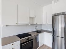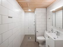 Tässä tilavassa asunnossa on tammensävyinen laminaatti ja valkoiset seinäpinnat sekä moderni keittiö laadukkailla materiaaleilla - kaunis kvartsikomposiittitaso sekä kiiltäväpintaiset valkoiset kaapistot ja Electroluxin kodinkoneet. Varustukseen kuuluu mm. jääkaappipakastin, induktioliesi sekä astianpesukone. Moderni teema jatkuu kylpyhuoneessa, joten myös sieltä löytyvät vaaleat ja tyylikkäät pinnat sekä kiintokalusteet. Tilassa on lasinen suihkuseinä ja paikka täysleveälle pyykinpesukoneelle. Tilan tuntua tuovat suuret ikkunat ja kesäisin ilahduttava oma terassi.