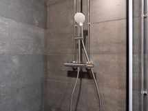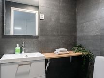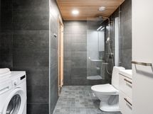 - Suihku, Suihkuseinä, Pesukone, Peilikaappi, Allaskaappi, Laattalattia, Laattaseinä, Erillinen WC, Lattialämmitys