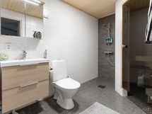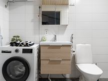 - Pesutilojen varusteet: WC-istuin, suihku, pesukoneliitäntä, lattialämmitys, peilikaappi ja allaskaappi. Pesutilojen kuvaus: Asunnosta löytyy pyykinpesukone. Seinät ovat laatoitetu valkoisella laatalla, tehosteseinä ja lattiat harmaita. Peilikaappi ja allaskaappi ovat tammen väriset.