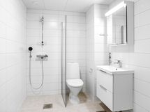 Rauhallinen värimaailma jatkuu kylpyhuoneessa vaaleanharmaana laattalattiana ja valkoisina kaakeleina. Lattiassa on mukavuuslattialämmitys. Kylpyhuoneen varusteisiin kuuluu valaisinpeilikaappi, allaslaatikosto ja pieni pyykkikaappi. Kylpyhuoneessa on tilaa myös pyykinpesukoneelle.