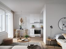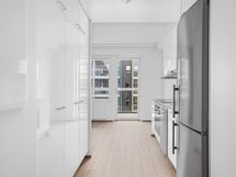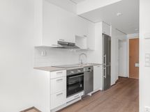 Keittiö on kompakteihin neliöihin sopiva, toimiva kokonaisuus, josta löytyvät mm. astianpesukone, kalusteisiin integroitu uuni ja keraaminen keittotaso sekä erillinen jääkaappi-pakastin. Keittiössä on lisäksi maitokahvin värinen kvartsitaso, kauniit valkoiset kaapistot sekä led-valaisin.