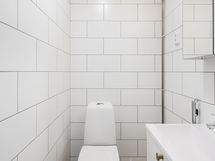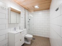 Avokeittiö on varustettu täyskorkealla jääkaapilla sekä pakastimella, laadukkailla Electroluxin kodinkoneilla ja kauniilla kvartsi-komposiittitasolla. Välitilassa on lasi ja vetimet ovat messinkiset. Rauhallinen ja raikas värimaailma jatkuu kylpyhuoneessa, josta löytyy tilava allaskaappi sekä peilikaappi ja hyvin tilaa pesutornille. Tilassa on lasinen suihkuseinä ja pyykkikaappi. Asunnossa on myös erillinen, pienempi wc-tila.