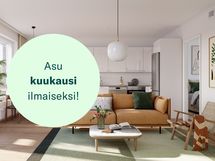 Kampanjaehdot: Kampanja voimassa Juli Lamminpään Taiteilija asuntoihin, joihin solmitaan toistaiseksi voimassa oleva vuokrasopimus 12 kuukauden minimiasumisajalla. Jotta voit hyödyntää kampanjamme, asunnon vuokraus on tehtävä verkkosivuillamme 1.12.-31.12.2025 välisenä aikana. Vuokrauksen yhteydessä maksettu ennakkovuokra vähennetään kolmannelta täyden kuun vuokralaskulta ja kampanjaetu vähennetään neljänneltä täyden kuun vuokralaskulta. Mikäli sopimus on kestänyt alle 4 kuukautta, kampanjaetua ei hyödynnetä eikä sitä hyvitetä vuokralaskulta. Mikäli sopimus irtisanotaan ennen minimiasumisajan päättymistä, aiemmin hyvitetty kampanjaetu laskutetaan viimeisessä vuokralaskussa. Kampanjaetua ei voi hyödyntää aiemmin tehtyihin vuokrasopimuksiin eikä etua voi yhdistää muihin kampanjoihin. Kampanjaetua ei voi hyödyntää sopimusmuutoksissa, asunnonvaihdoissa Juli-kodista toiseen minimiasumisaikana tai jos vuokranmaksu ei ole ajan tasalla. Kampanjaetu ei koske vesimaksua.