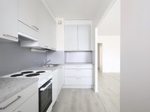 Asunnossa on uusi vaalea laminaatti, keittiö on uusittu ja kaikki seinät maalattu. Keittiön varustukseen kuuluu jääkaappipakastin, uuni ja liesi sekä astianpesukone. Kylpyhuoneessa on paikka ja liitännät pyykinpesukoneelle. Asunnossa on suuri lasitettu parveke.