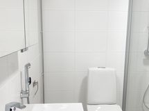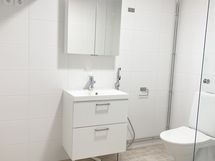 Varustus: suihkuseinä, pesukoneliitäntä, wc-istuin, suihku, peilikaappi.