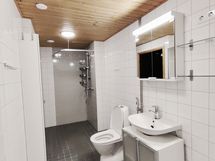 Varustus: pesukoneliitäntä, lattialämmitys, wc-istuin, suihku, peilikaappi, kylpyhuonekaapisto.