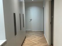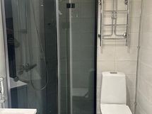 - Pesutilojen kuvaus: Remontoitu kylpyhuone, jossa wc-istuin, allas, allaskaappi, , peili, suihku, suihkuseinä, paikka pesukoneelle.