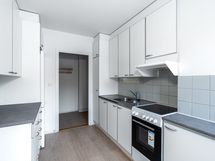 Keittiössä on perinteinen liesi ja jääkaappi. Tulo- ja poistoliitännät pyykinpesukoneelle löytyvät kylpyhuoneesta.