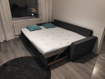 Asunnossa on yksi 140cm leveä Unigold sänky, kaksi 80cm leveää pussijousitettua suomalaisvalmisteista sänkyä ja sohvan saa levitettyä parivuoteeksi, jonka leveys on 155cm. Näistä kaksi 80cm sänkyä on yhdistettävissä 160cm parisängyksi patjakiilan avulla. 160cm sänkyyn on petari saatavilla samoin kun sohvaan myös (näkyy kuvissa). Uusia yöpöytiä voin ostaa tarvittaessa.
