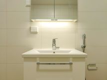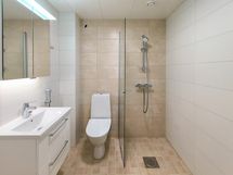 Suihku, pesukoneliitäntä, peilikaappi, WC. Lattia: Laatta. Seinät: Laatta
